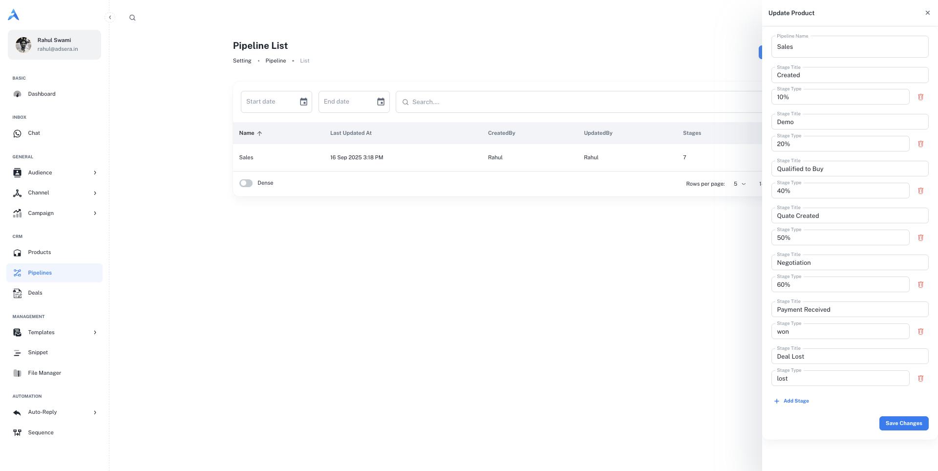 The pipelines you create here are the framework for managing your sales opportunities. Each opportunity is represented as a Deal, which is then placed in a specific stage of a pipeline. As the deal progresses, you simply drag and drop it from one stage to the next, giving your entire team a real-time visual update on your sales efforts.Learn more about Managing Deals.